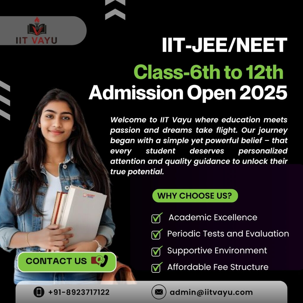 IIT VAYU is a dynamic and rapidly growing institute committed to preparing students for IIT-JEE, NEET, and Foundation-level competitive exams. With a focus on excellence in education, we aim to empower young minds through expert mentorship, innovative teaching strategies, and a student-first approach. Our vision is to nurture talent and build strong academic foundations that lead to success in competitive exams and beyond.